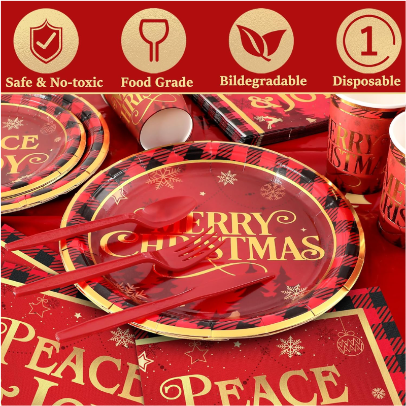 Premium Material: Red and black buffalo plaid Christmas disposable tableware is made of high quality thick paper and recycle paper, will not disturb the environment. They are food-grade, non-toxic, environmentally friendly, sturdy. Please rest assured to use!