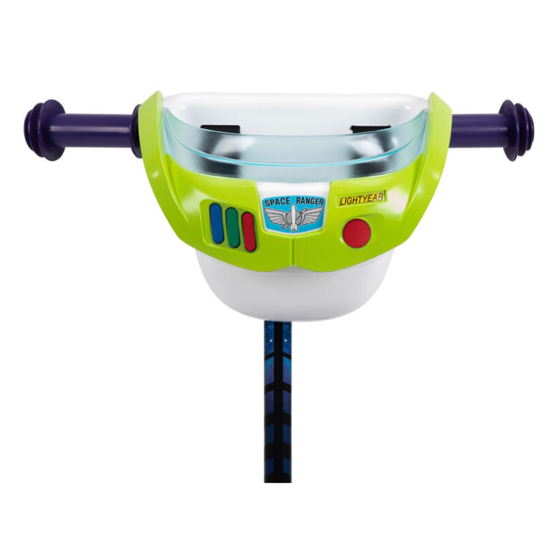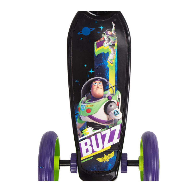 Soft purple PVC grips stay comfortable for every ride. The deck’s wide, non-slip surface is fully decorated with hero shots of Buzz – see him soaring into space, and looking upwards to the stars, determined yet again to take on the evil Zurg.