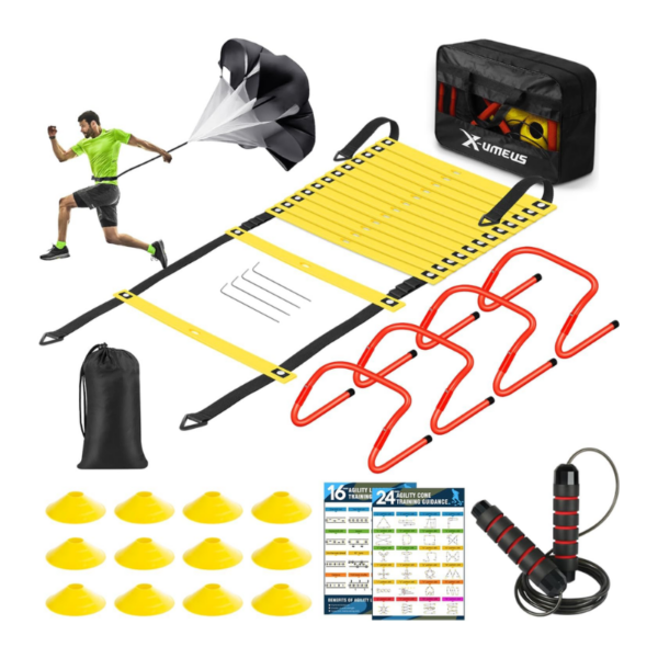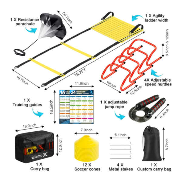 “Agility Training Equipment Kit”: Includes 20-foot advanced agility ladder with fixable 4 stakes, 4 Agility hurdles,12 yellow disc Soccer Cones, and running parachutes. Whether you are a beginner or an expert, the agility training equipment can meet your training requirements.