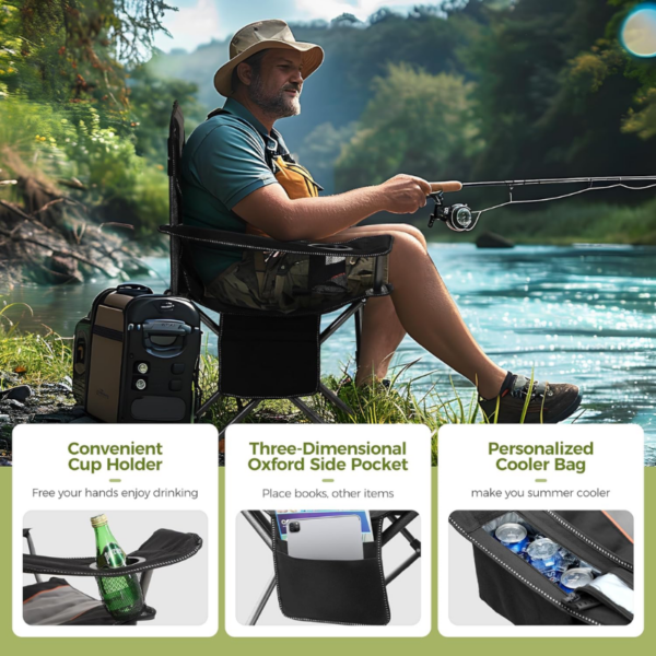 With hammer tone powder coating prevent corrosion and fading. four heavy duty steel frame were added to the bottom of the chair. A durable mesh cup holder and armrest at the perfect height allow you to relax in comfort. The side storage pocket holds a cell phone, notebook, and maps, and a side cooler bag will keep you cool on a hot summer day!
