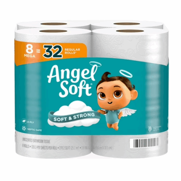 Angel Soft Bath Tissue, white, 8 mega = 32 rolls. Each mega roll has 320 2-ply sheets and is designed to fit in standard bathroom toilet paper holders. 8 mega rolls = 32 regular rolls, so you won’t have to change the roll as often. Angel Soft is safe for use in standard sewer and septic systems, breaking down easily after flushing for a hassle-free use., 270.22 sq. ft. per roll.