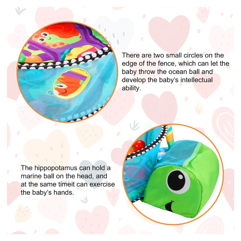 Our turtle animal-themed baby play mat is designed to foster a child’s growth and creativity while enhancing parent-child interaction. This play mat comes equipped with a secure fence, a collection of 30 vibrant ocean-colored balls, and an array of hanging colorful toys. Crafted from soft, baby-safe materials, it provides a comfortable environment for your baby and is easily washable for hassle-free maintenance.
