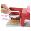 Start with the beige dough and the tomato-colored dough: use the pizza press to flatten a pizza crust and sauce on the conveyor pan. Slide the belt lever and the pizza along until it rests under the cheese grater. Add ‘cheese’ using the white dough: press into the shredder and once the grater is locked into position, turn the hand crank to sprinkle the topping onto the pizza.