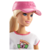 • Play out all kinds of stories with a Barbie doll dressed as a pizza chef with a pizza decal on her shirt and a classic pink and white check print on her skirt. A pair of pink shoes, a pink cap, and a green apron complete the look.