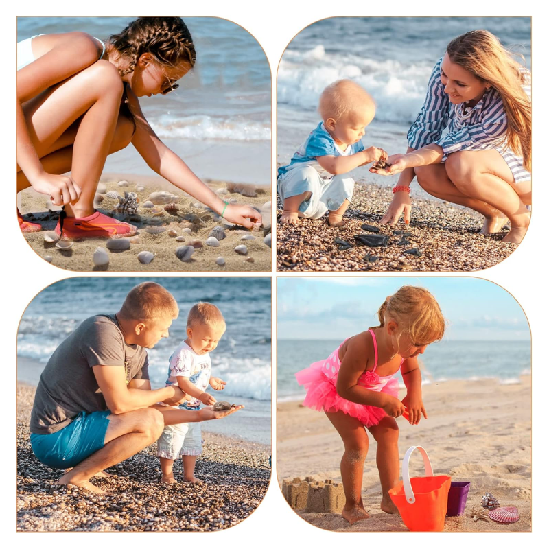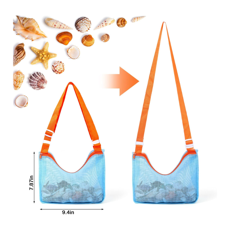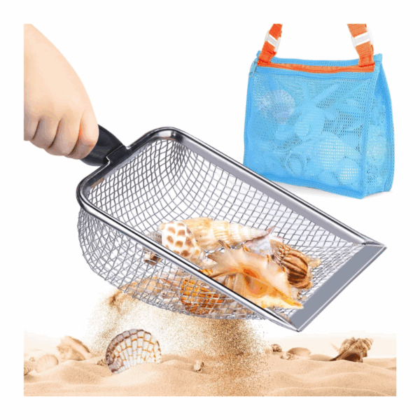 The beach shovel is able to sift through sand and shells, making it easier for children and adults to collect shells on the beach. The beach mesh bag has an enlarged bottom to allow for more shells to be collected.