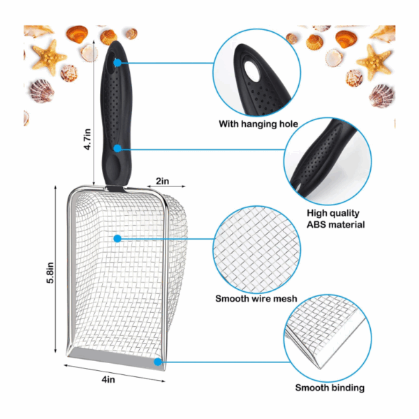 Contains a mesh sand filter scooper and a mesh bag, if sand and water get in they fall out easily and you can find the shells and fossils hidden in the sand easily.