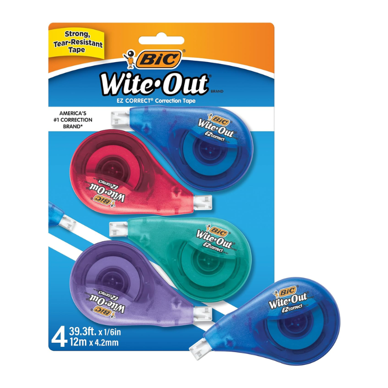 One 4-count pack of BIC White-Out Brand EZ Correct Correction Tape, a tear-resistant, film-based correction tape with a tape dispenser offering maximum comfort and control