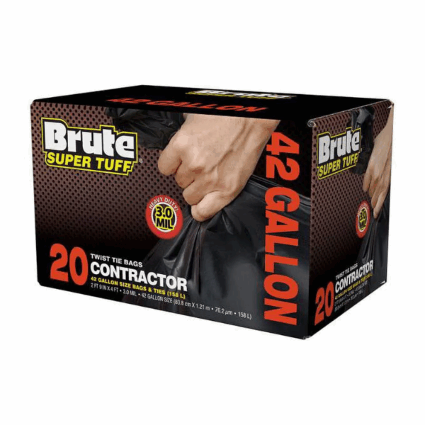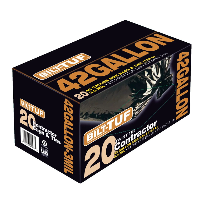 42 GAL H-D CONTRACTOR TRASH BAGS Bilt-tuf label 42 gal contractor bags Heavy-duty 3.0 mil thickness 20 bags with twist tie closures per box Bag dimensions: 2ft 9″ x 4 ft Color black Made in USA 61239 42G 3MIL CONTRACTOR BAG SIZE: 42 Gal