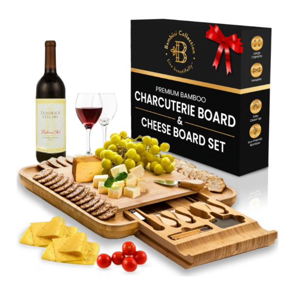 - DURABLE & SUSTAINABLE BAMBOO CHEESE BOARD: Crafted from 100% natural bamboo, this cheese board set is both durable and eco-friendly, making it a lasting addition to your kitchen for regular use. Ideal for house warming gifts new home, bridal shower gifts, or as part of your holiday table, this charcuterie board stands up to frequent use with style and sustainability.