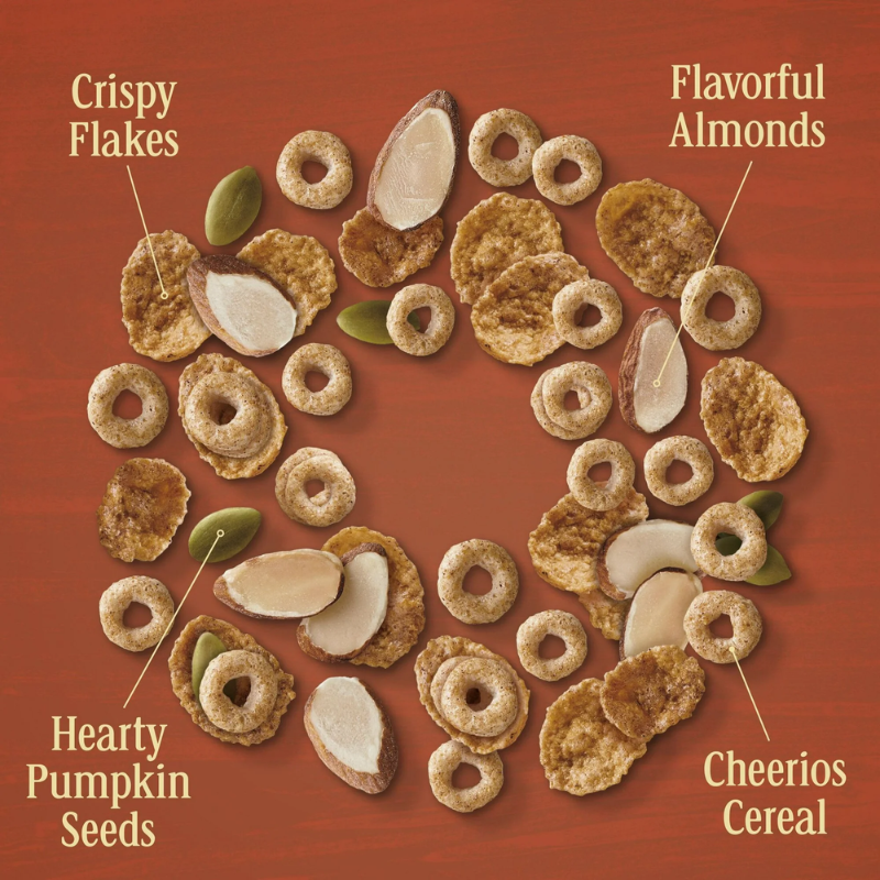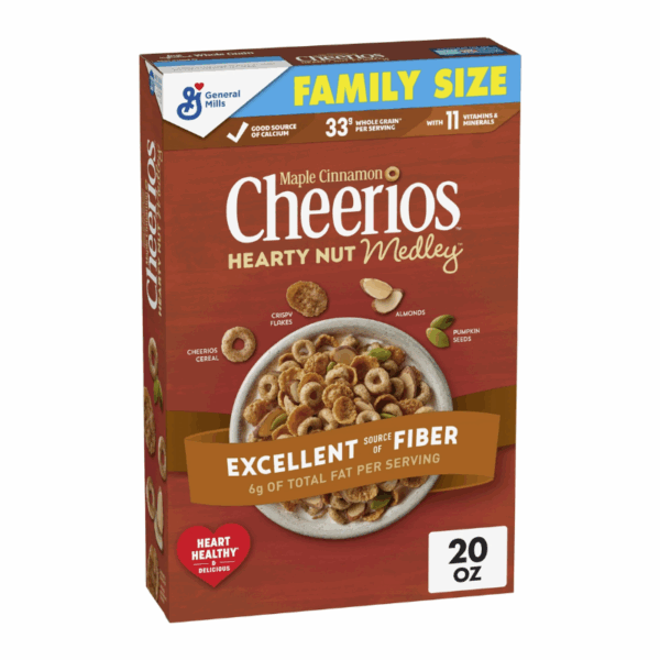 - CONTAINS: One 20 oz Family Size cereal box of Cheerios Hearty Nut Medley Maple Cinnamon Flavored Cereal
