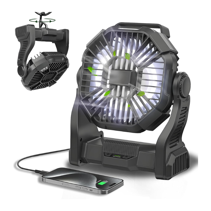 The CONBOLA portable rechargeable fan has a low-noise design that ensures a strong breeze, all while being whisper-quiet. The noise is less than 30db on its lowest setting.