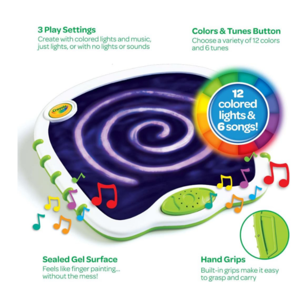 Empower your little one’s imaginative play with the Crayola Toddler Touch Lights Musical Doodle Board, a self-contained toddler tablet that brings a symphony of lights and sounds to their fingertips. This sensory board is designed to stimulate tiny fingertips with textures and colors, making it an exceptional educational tool that sparks learning and development in toddlers.The sealed gel surface provides a safe canvas for doodling with fingers, offering a mess-free, portable play experience.