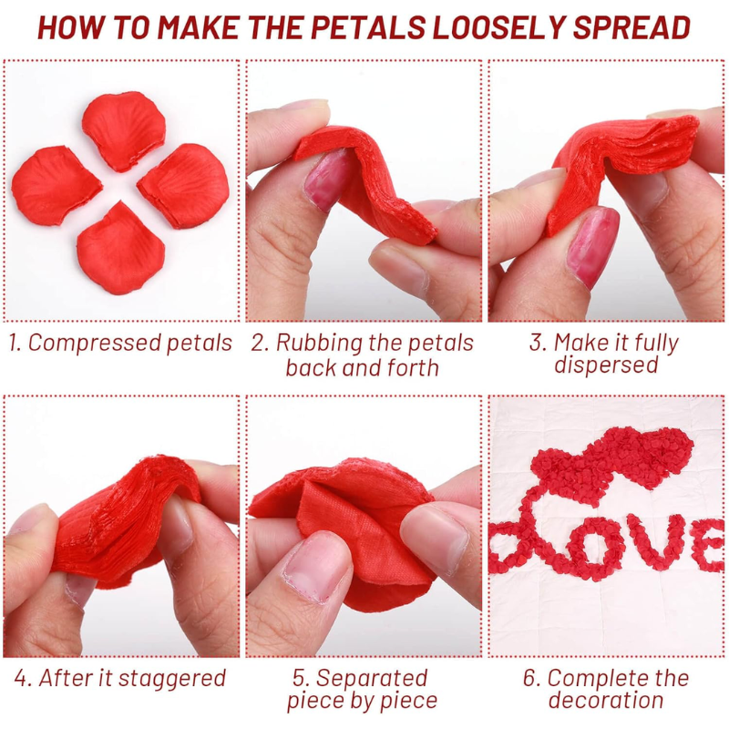 Great Amount Dark-Red Rose Petals – Made of silk material, Non-toxic and will not fade or wither. These rose petals appear extremely realistic, separated the petals piece by piece, spreaded or Arranged as a romantic symbol in weddings, romantic dates, Valentine’s Day, marriage proposals, table spreads and aisles