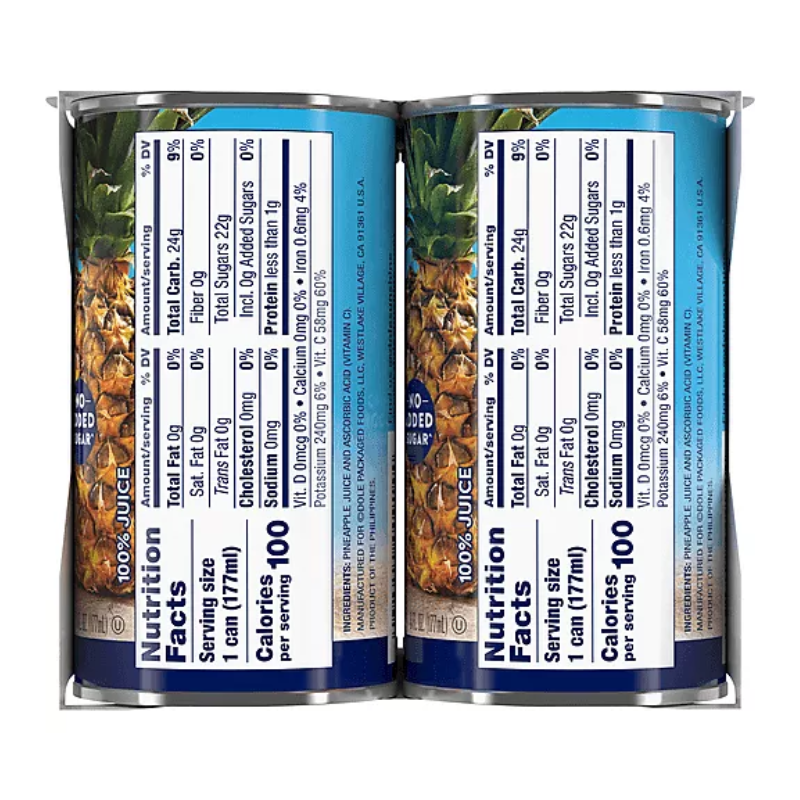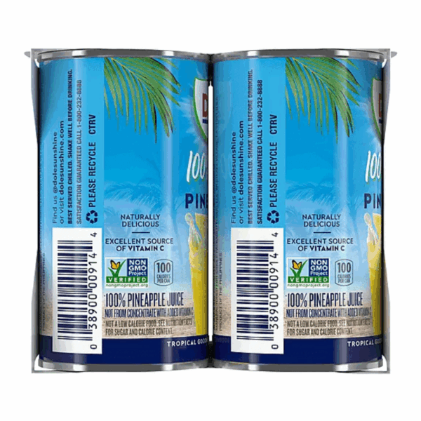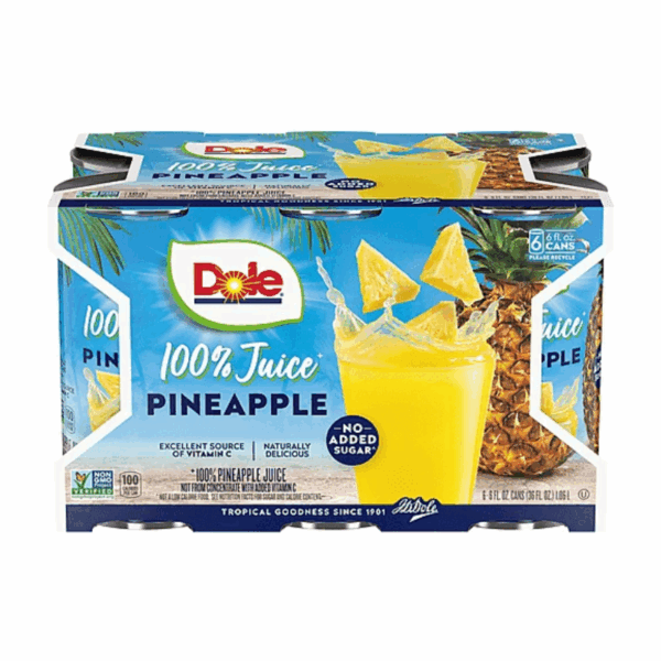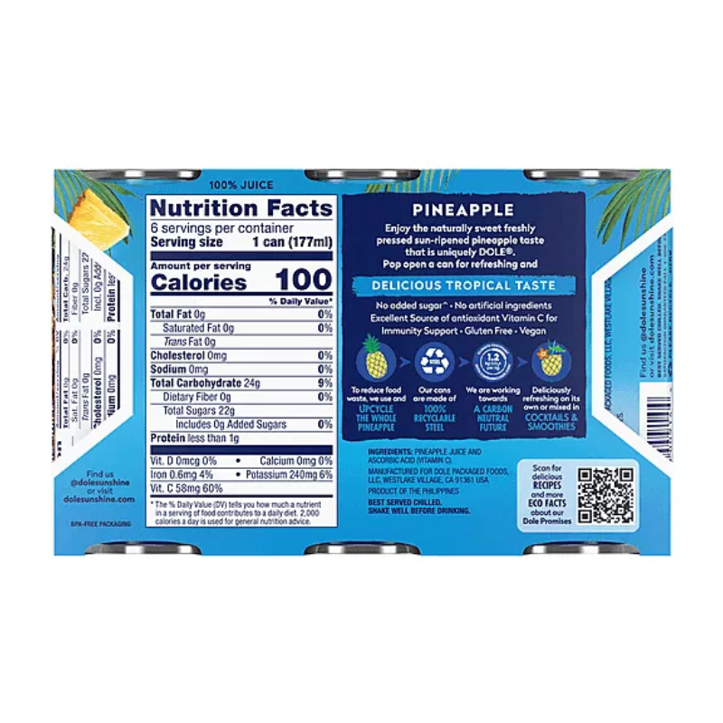 Pineapples are a symbol of hospitality, tropical vacations and fun, so it makes sense Dole would take this yummy goodness and put it in a can. Dole Canned 100% Juice is refreshing, exotic and a delicious alternative to other juices. Dole Juice is 100% juice that is an excellent source of Vitamin C and a good source of vitamins A & E.