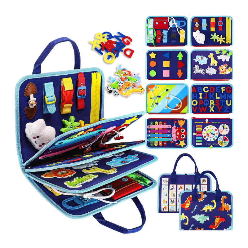 Our innovative busy board for toddlers has eight pages to play, featuring multiple varieties of toddler activities, and can keep your little one busy for hours. This toddler busy board is designed in varying difficulty levels to be challenging but not too much to keep your toddlers interested. Including zipper, shoelace, belt, button, clock, calendar, shapes matching, threading 1 2 3 numbers, A B C and 1 2 3rs, jigsaw animal puzzle, hook&loop lette etc.