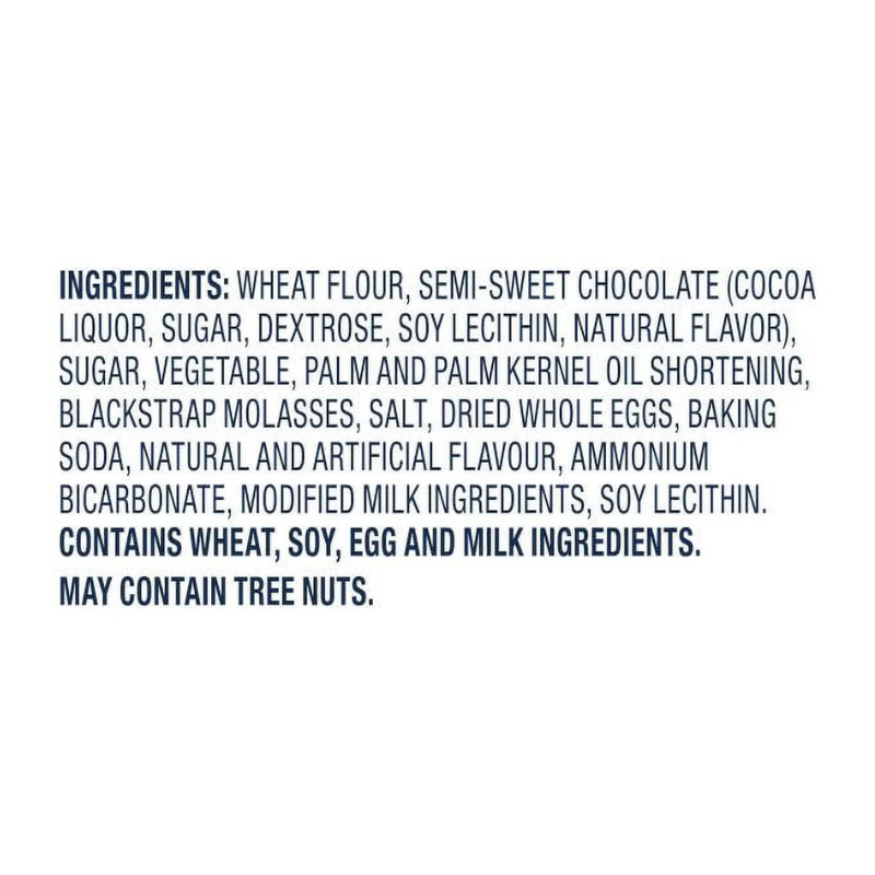 WHEAT FLOUR, SEMI-SWEET CHOCOLATE (COCOA LIQUOR, SUGAR, DEXTROSE, SOY LECITHIN, NATURAL FLAVOR), SUGAR, VEGETABLE, PALM AND PALM KERNEL OIL SHORTENING, BLACKSTRAP MOLASSES, SALT, DRIED WHOLE EGGS, BAKING SODA, NATURAL AND ARTIFICIAL FLAVOUR, AMMONIUM BICARBONATE, MODIFIED MILK INGREDIENTS, SOY LECITHIN.