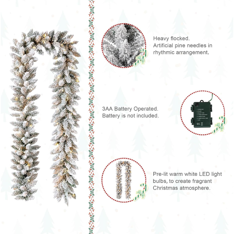 Pre-strung with 50 Warm White LED Lights, choose the steady or twinkle and breathing functions to bring a charming glow to your home. Energy-efficient and long-lasting LED bulbs, On/Off Timer with 6 hours on and 18 hours off brings you convenience. Note: 3AA Battery Operated, Battery is not included. The 9-foot snow-flocked garland provides ample length to easily adorn doors, mantels, or banisters, making this versatile decoration ideal for any situation.