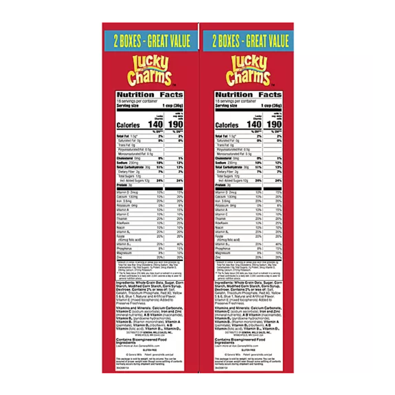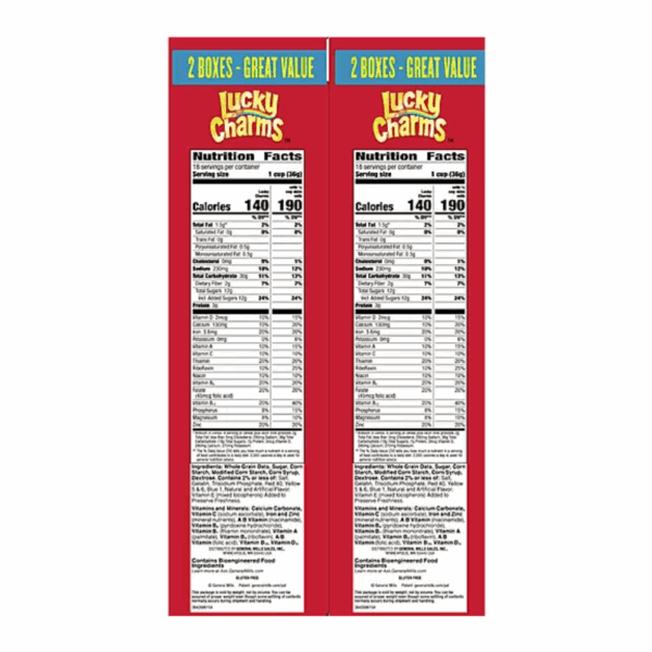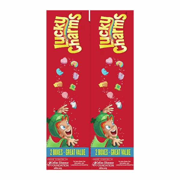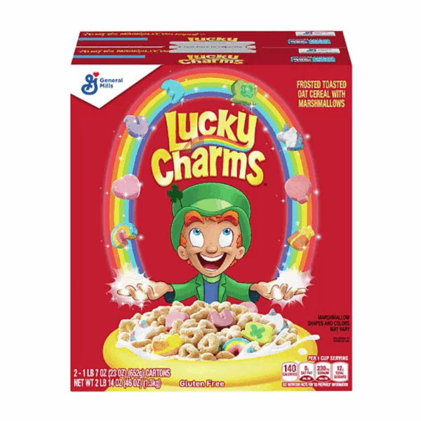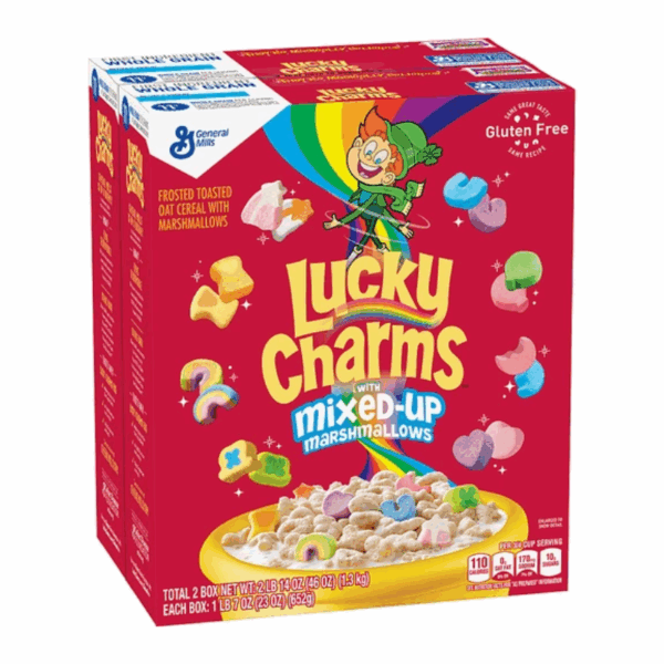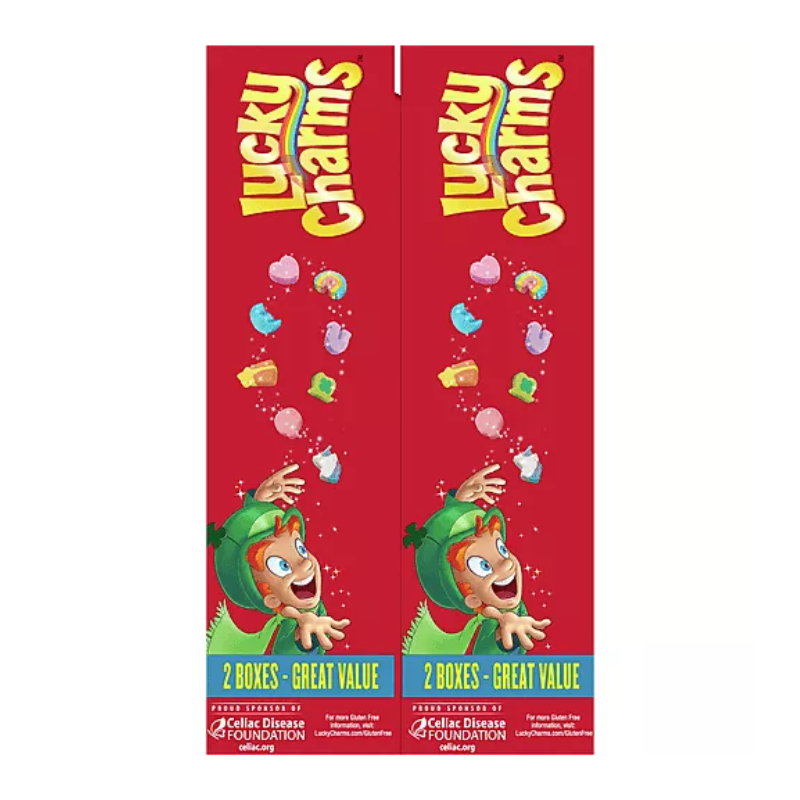 Give your family a lucky start with this classic favorite. These Lucky Charms come in two boxes for double the fun. Magically delicious Lucky Charms Cereal features frosted oats and colored marshmallow shapes for a sweet, crunchy start to your day: enjoy hearts, stars, horseshoes, rainbows, blue moons, clovers, unicornsand tasty red balloons.