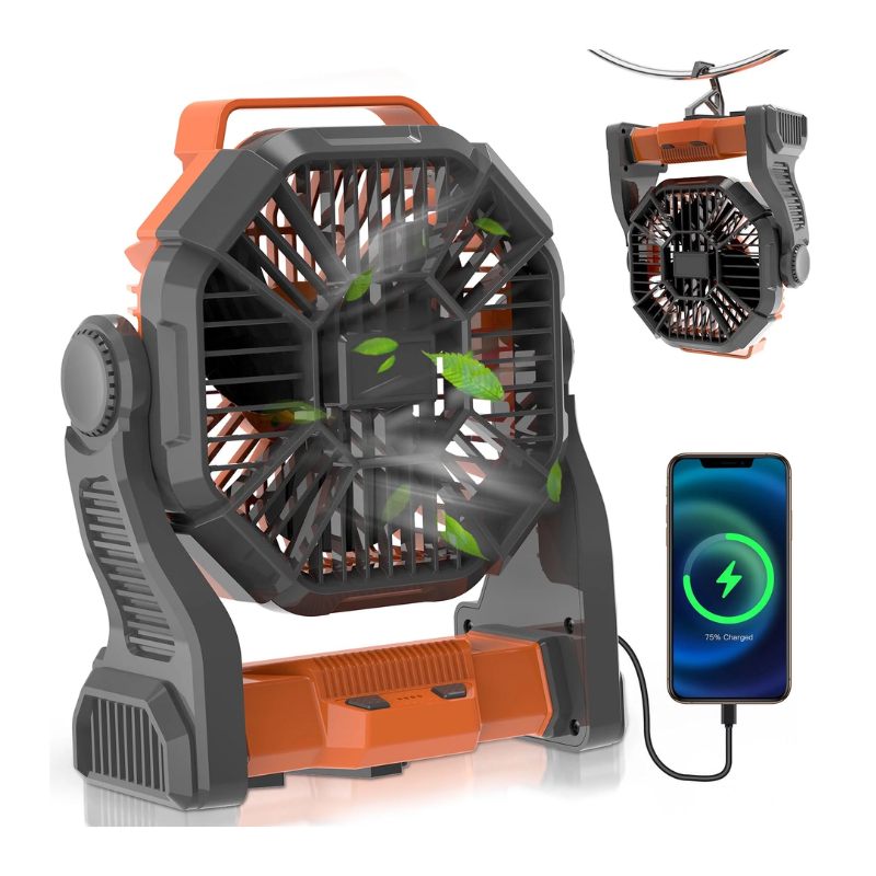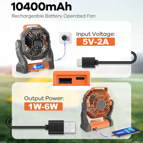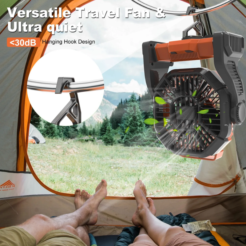 The GVDV portable camping fan with LED light is a feature-rich outdoor accessory. This fan utilizes a brushless motor, offering efficient airflow and a powerful battery capacity. The 10400mAh rechargeable battery provides a working time of 7-60 hours (without light), making it an ideal choice for various scenarios such as camping, fishing, home, and office.