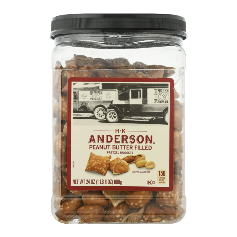 A 24-ounce container of HK ANDERSON Peanut Butter Filled Pretzel Nuggets combines two classic snacks to create a hands-down favorite treat.