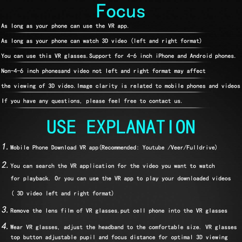 • Compatible with 4-6 inch size iPhone and Android phones; VR glasses for iPhone X 8 7 plus / 6s / 6/6 plus; Samsung s9/s8/s8 plus/s7/s7 Edge/s6/s6 Edge Note8/5/4/3; LG g6 g5 g4 g3 v20; and Daydream phones like Google Pixel/Pixel XL, Huawei Mate 9 Pro; Nexus 5, 6P;5; U11 etc.