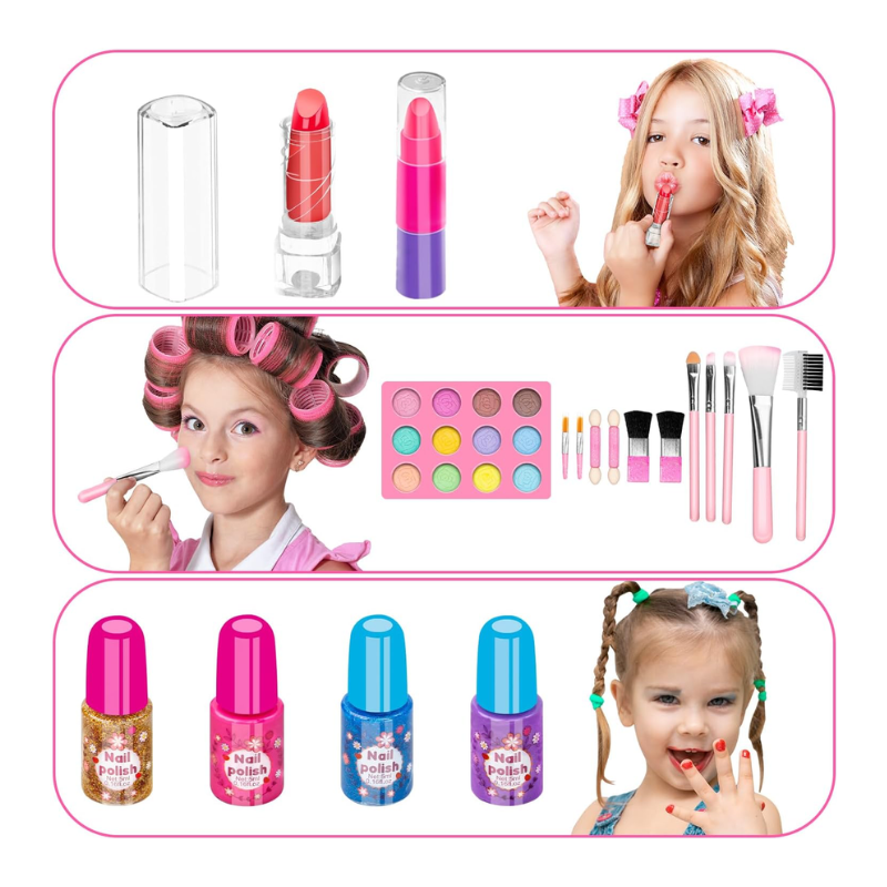 【Mess-free & Easy to Store】: This is a compact pink makeup set for girls, all the items come packed in a neat carrying case for easy storage. There are fixed colors in the cosmetic case, children can see all the colors at a glance so that they can choose favourite color, and it’s not easy to lose and avoid breaking during carrying.
