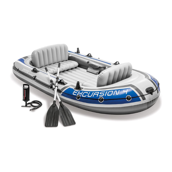 With an inflated size of 10’4″ x 5’5″ x 1’5″ and a maximum weight capacity of 1100 pounds, the Excursion 4 blow up boat is large enough to sit four adults comfortably. Includes two 54 inch boat oars, two detachable fishing rod holders, gear pouch, carry bag, high-output pump and a repair patch