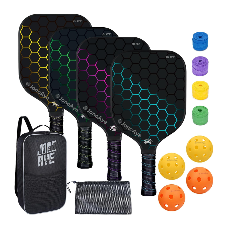 JoncAye BLITZ pickleball paddles 4 pack are made of top-grade fiberglass with excellent strength and stiffness. Each paddle weighs an optimal 8 oz, a great balance of power and control. These light pickleball racquets suit players of all levels. They allow you to swing the paddle for long time with less stress on the shoulder and on the waist. The large spot design is especially friendly to beginners and intermediates
