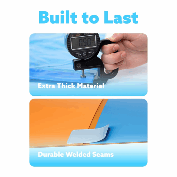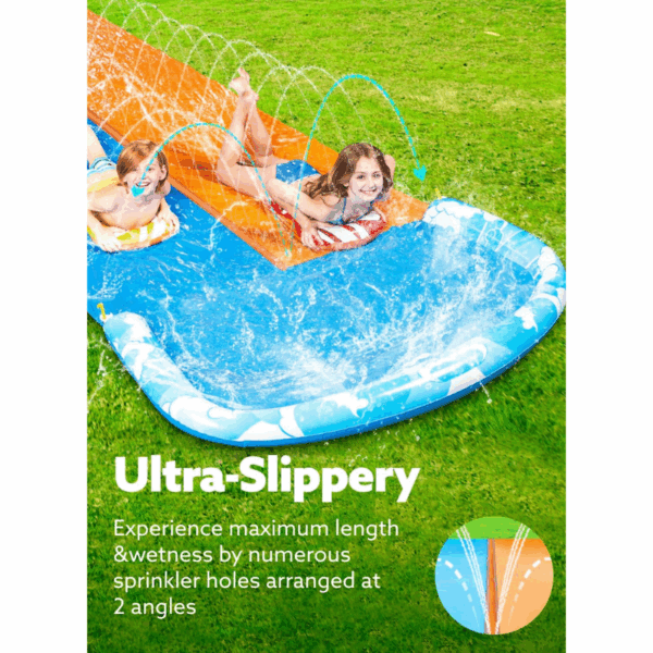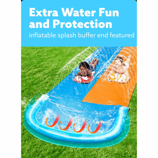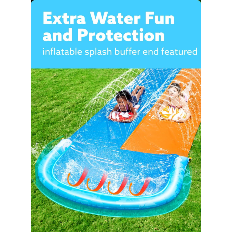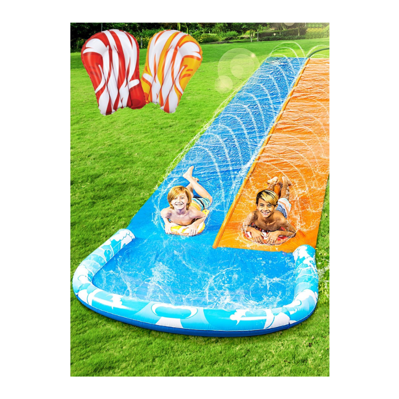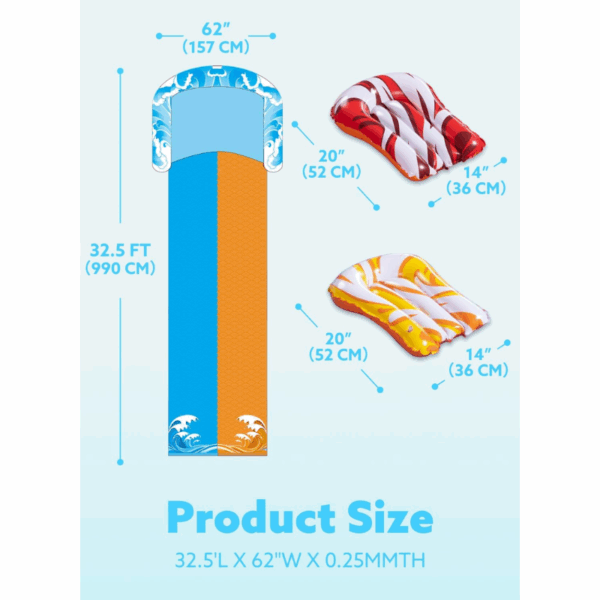 Our Outdoor Water Slide 22.5ft x 62in Waves Double Lawn Water Slide includes a 22.5ft x 62in Waves Double Lawn Water Slide, 2 inflatable boards, 21.7″ x 16.5″, middle sides built in sprinkler, 6 ground stakes, featured with end splash pool.