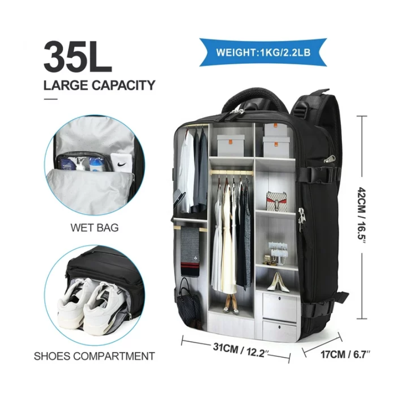 【Separate Shoe Compartment Design & Wet Bag】Main pocket x 2, laptop compartment x 2 (fit for a 13” tablet and 14” laptop respectively), and many other pockets for different purposes. The wet bag is made of high density water resistant material can help you to separate dry items and wet items,if you have wet clothes or towel,you can put it in wet bag. A separate shoe compartment can help you carry and keep your shoes better in your travel bag.