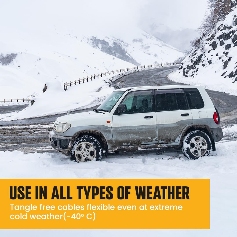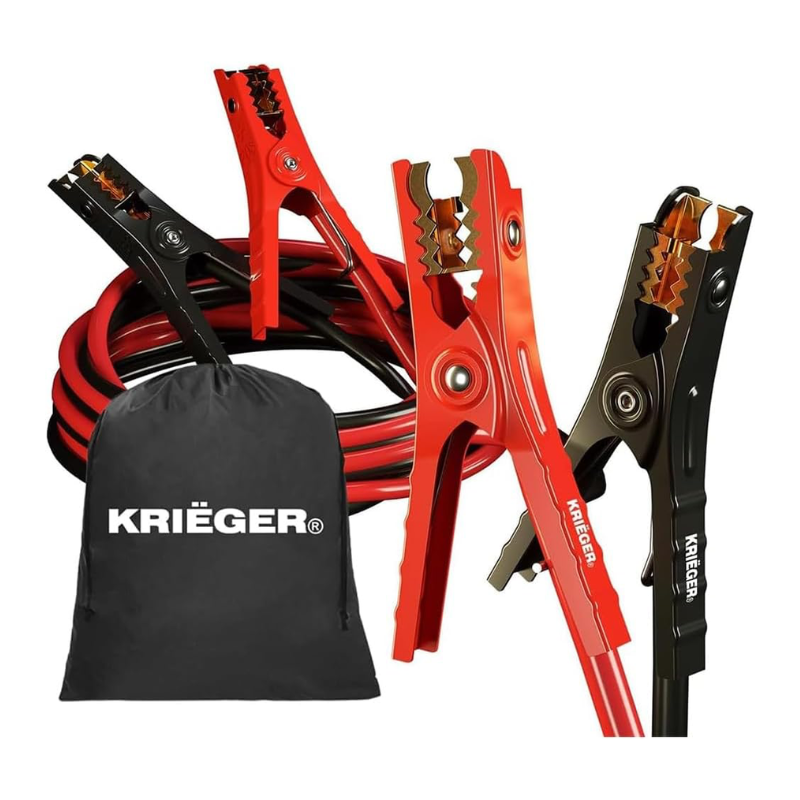 2 Gauge, 25 FT booster battery jumper cables for jump starting a dead or weak battery. Ideal for trucks, SUVs, full-size cars, mid-size cars, and small/compact cars. Includes a strong spring and a comfortable handle for secure placement and easy positioning. Safety features of shelled vinyl-coated clamp for rust and corrosion protection. Our Krieger jumper cables come with a high-grade travel bag for easy transport and compact storage. The 25-foot length makes it easy to reach from one car battery to another. Copper-clad aluminum cables remain flexible even at -40°C. Ideal for Trucks up to 6-liter Gasoline and 4-liter Diesel Engines.