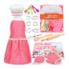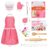 - Complete Cookie Chef’s Apron Set – Chef’s hat x 1, apron x 1, hot pad x 1, oven mitt x 1, wooden spoon x 1, Whisk x 1, rolling pin x 1, measuring spoons x 5, cookie cutters x 6, cookbook x 1. Fit for little chef’s all cooking and baking needs. All accessories of the chef kit are washable and safety tested, easy to store or carry.