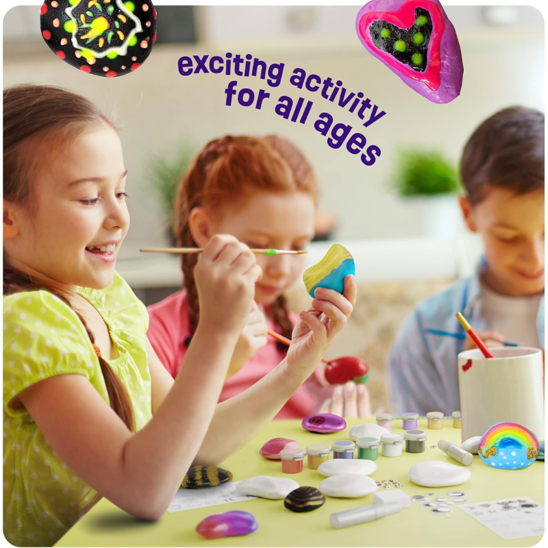 Includes: 10 natural white river rocks, 4 puffy glow-in-the-dark paints, 6 standard paints, gold & silver glitter glue, 2 paintbrushes (fine tip and wider tip), googly eyes, gem stickers, gold and black transfer stickers, and instruction manual.