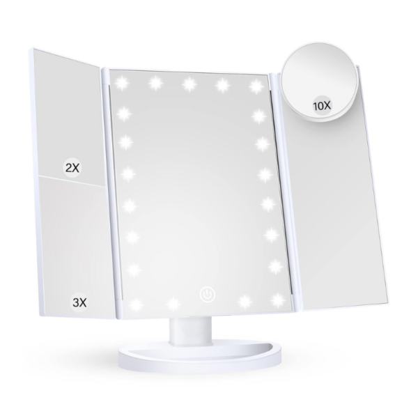 10X,3X,2X magnification modes; lighted makeup mirror has 3 panels magnifying and wide-angle viewing; see clearly your face and make a flawless makeup, suitable for desk makeup and handheld use. Note that the main mirror does not have 10X magnification