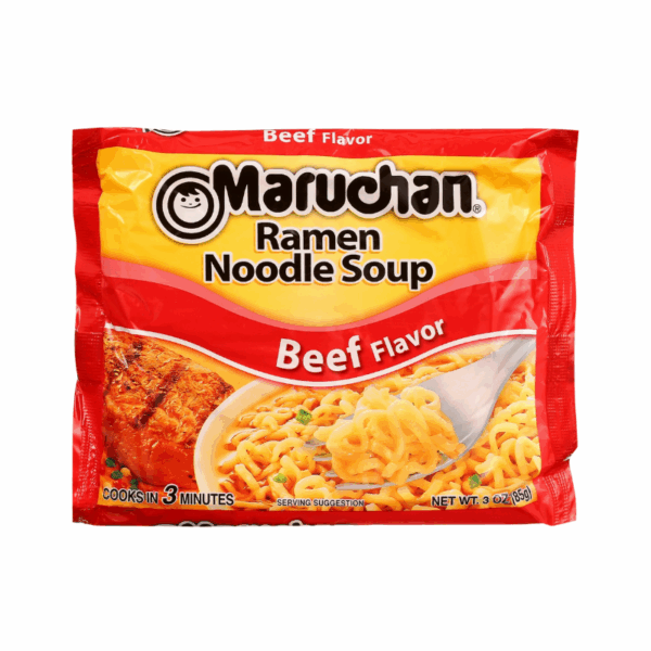 - Ramen Noodle Ingredients: Enriched Wheat Flour (Wheat Flour, Niacin, Reduced Iron, Thiamine Mononitrate, Riboflavin, Folic Acid), Vegetable Oil (contains one or more of the following: Canola, Cottonseed, Palm) preserved by TBHQ, contains less than 1% of: Salt, Soy Sauce (Water, Wheat, Soybeans, Salt), Potassium Carbonate, Sodium (Mono, Hexameta, and/or Tripoly) Phosphate, Sodium Carbonate, Turmeric.Soup Base Ingredients: Salt, Sugar, contains less than 1% of: Maltodextrin, Monosodium Glutamate, Caramel Color, Dehydrated Soy Sauce (Wheat, Soybeans, Salt), Spices, Beef Fat, Lactose, Hydrolyzed Corn, Wheat and Soy Protein, Yeast Extract, Dehydrated Vegetables (Garlic, Onion, Chive), Natural Flavor, Disodium Inosinate, Disodium Guanylate.