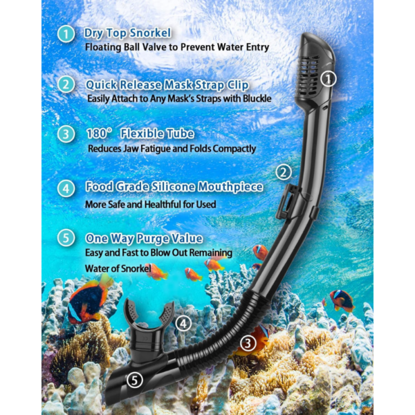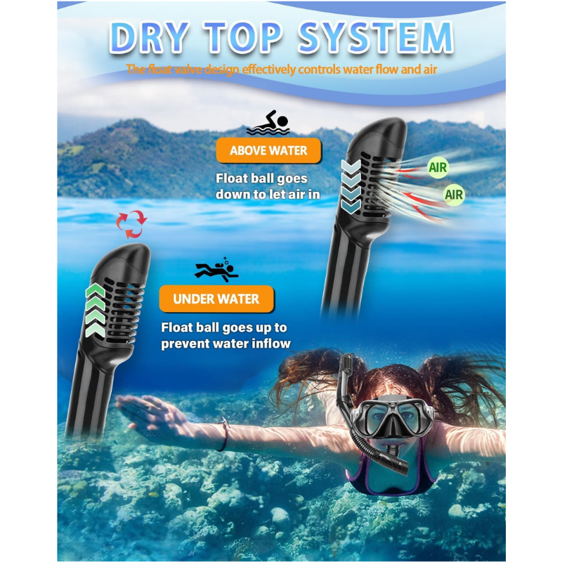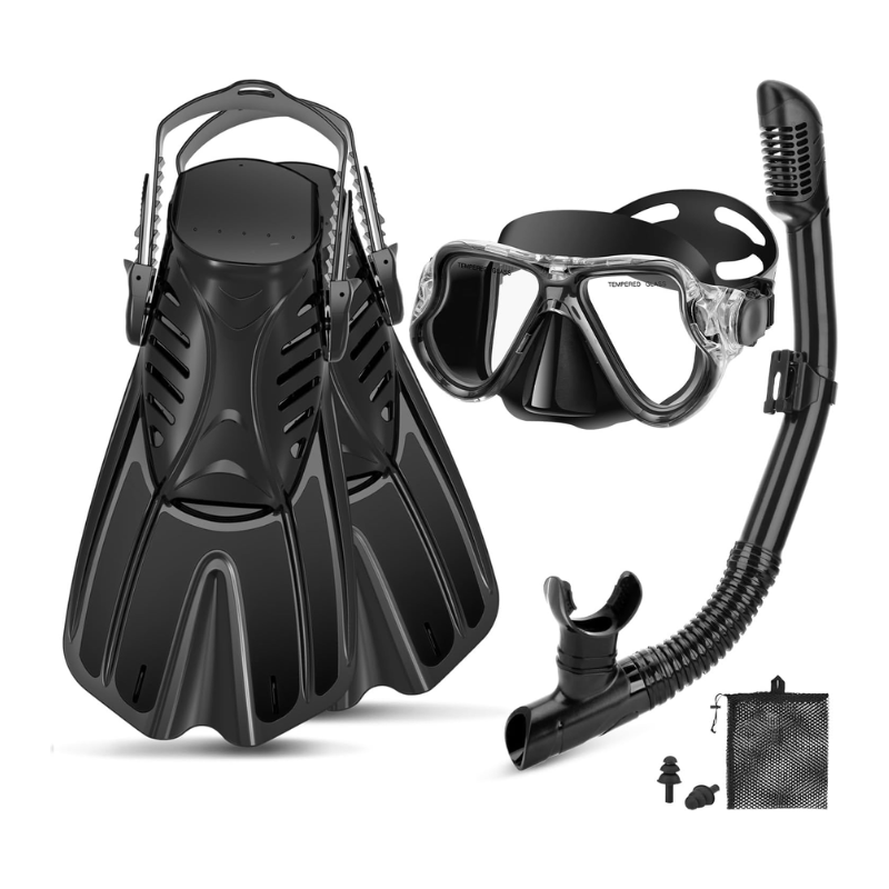 The Mask Fins Snorkel set includes Full Foot Pocket Adjustable Dive Flippers, HD Panoramic View Anti-Fog Mask, Dry Top Snorkel and Swimming earplugs. Our high quality adult snorkel set has all the gear you need for snorkeling to help you explore the underwater world cheerfully.