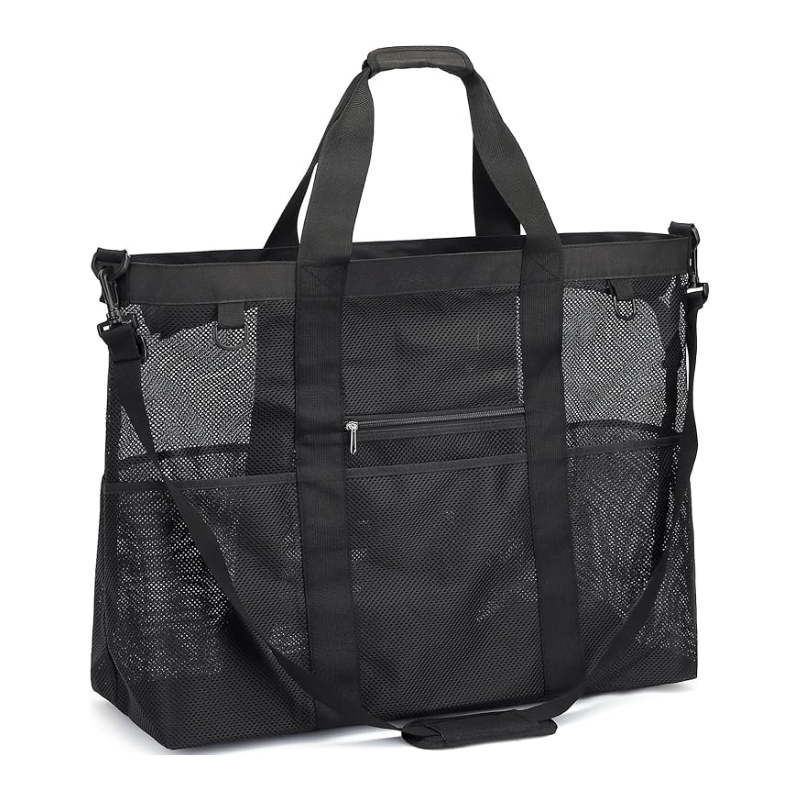 The 17.9″L x 9″W x 15″H mesh swim bag offers ample storage space for beach essentials like towels, sunscreen, body wash, shoes, water bottles, snacks, and other personal items.