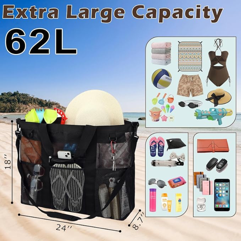 The 17.9″L x 9″W x 15″H mesh swim bag offers ample storage space for beach essentials like towels, sunscreen, body wash, shoes, water bottles, snacks, and other personal items.