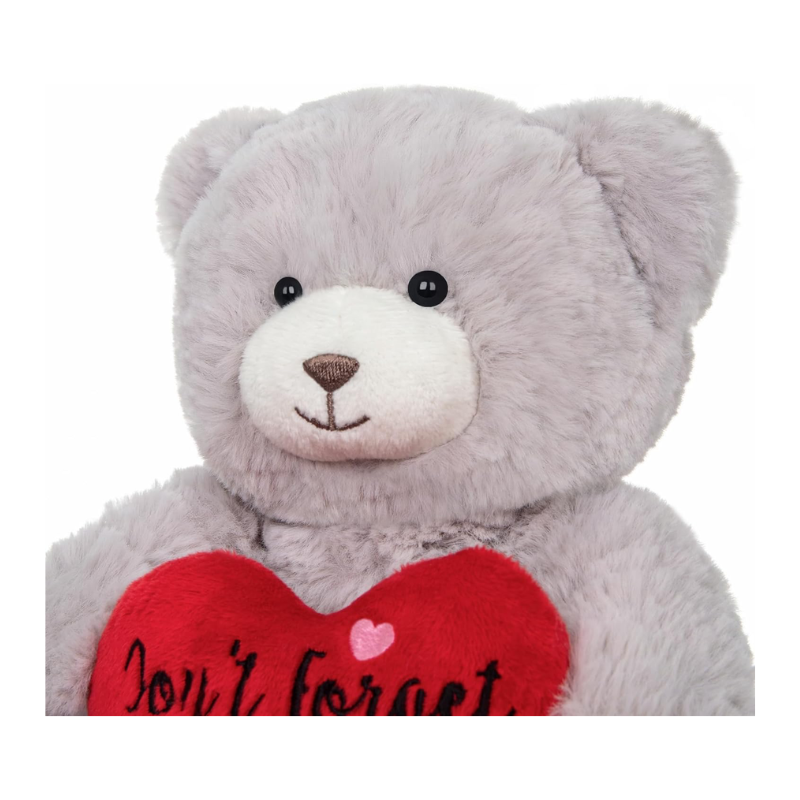 The teddy bear plush toy that features an adorable look with a red heart. The bear says “Don’t forget I love you”. Soft and flexible design makes this stuffed bear perfect for cuddling. Perfect size for little hands to hold.