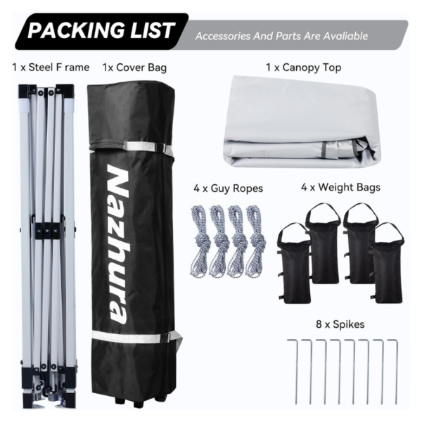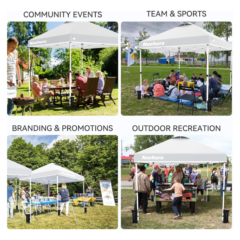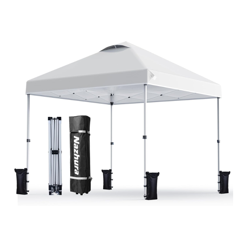 The canopy can be compacted with a click of a button and easily transported with wheels and a rugged handle. This means you can take it with you wherever you go, making it perfect for outdoor fun like camping, parties, and birthdays.
