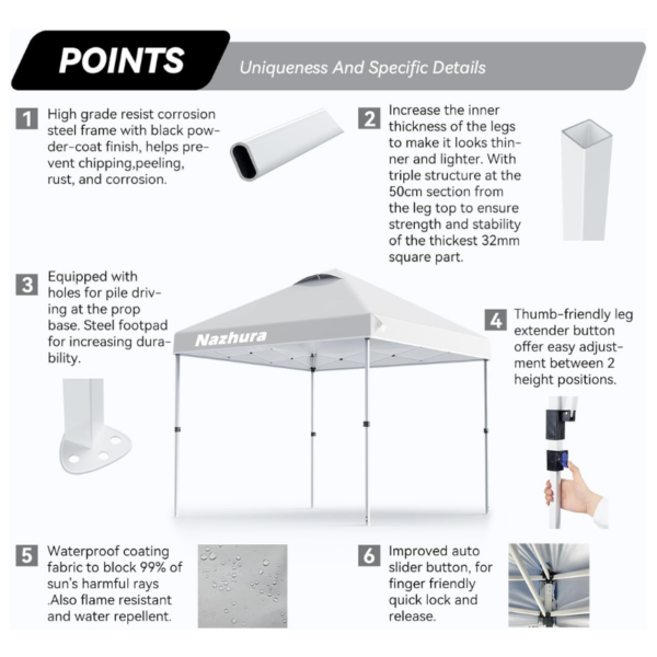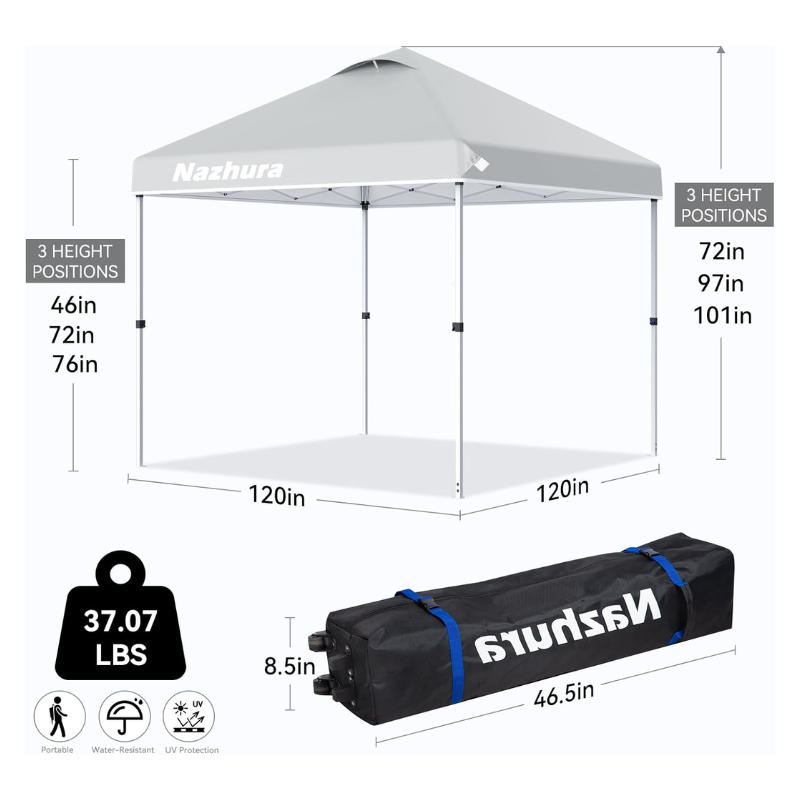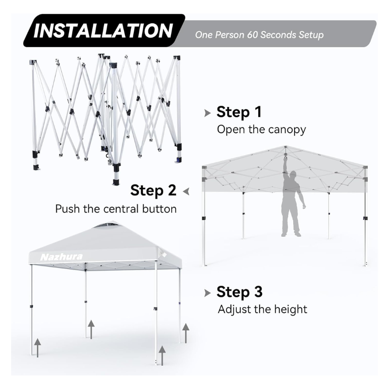 The canopy is designed for easy setup and breakdown with a central button and no-pinch height adjusters, making it a one-person job. This means you can spend less time setting up and more time enjoying the outdoors.