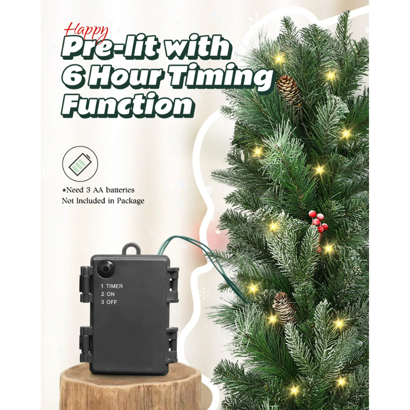 This Multi-Function Christmas of 165 PVC branch tips and 30 PE and 18 pine needles decorated with white snow, decorated with red berries, pinecones, and a pack of string lights is given as a gift. The pre-lit garland comes with 50 warm LED lights, adding a soft and warm glow to your Christmas decorations. The lights are evenly distributed throughout the garland, illuminating the pinecones, berry clusters, and snowy branches in a delightful manner. OasisCraft pine garland is powered by 3 AA batteries (not included), allowing you to place them anywhere without the worry of needing a plug socket nearby. You are able to set it up to 6-hour modes to reduce the power consumption.