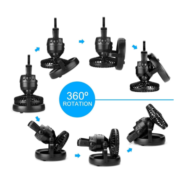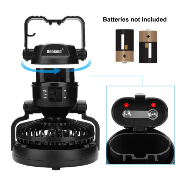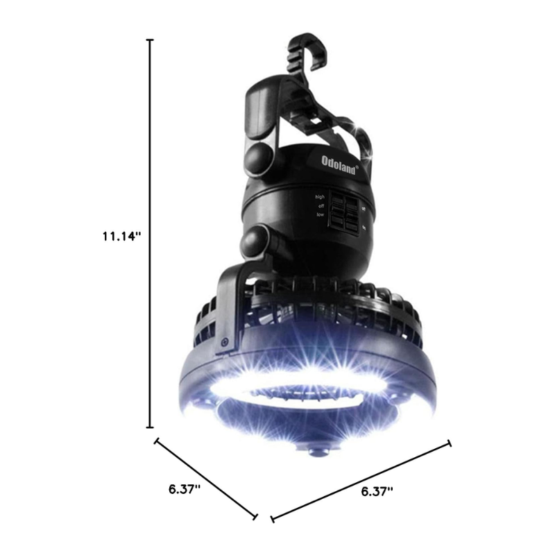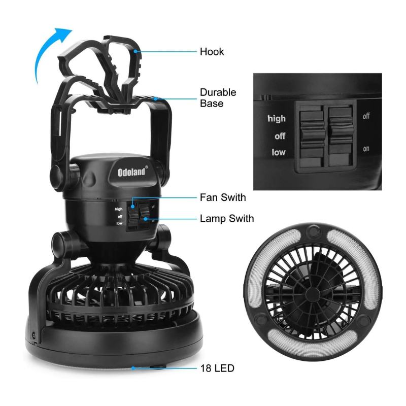 Portable fan combines tent fan and camping light. Lanterns are useful for lighting up your tent. Fan circulates air enables to cool down instantly. Ultra Bright 18 individual low-powered LED bulbs. The fan has high and low settings to provide nice air circulation and light up the tent. You can orient in so many positions.