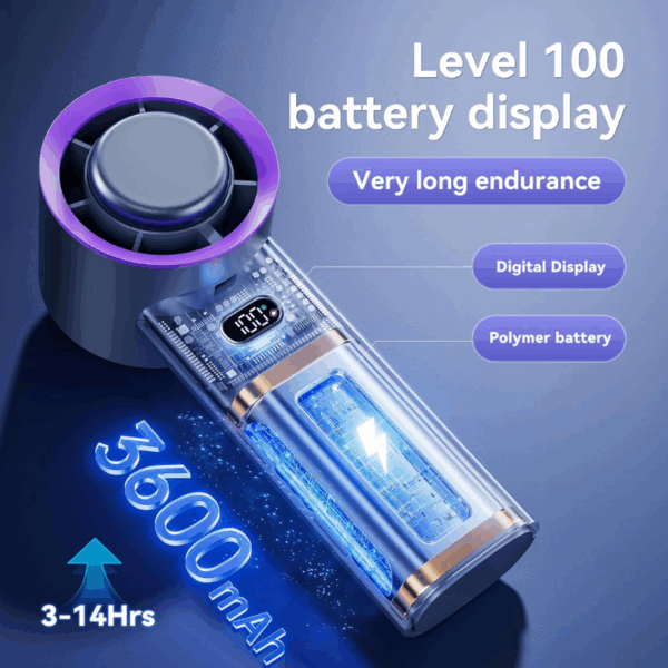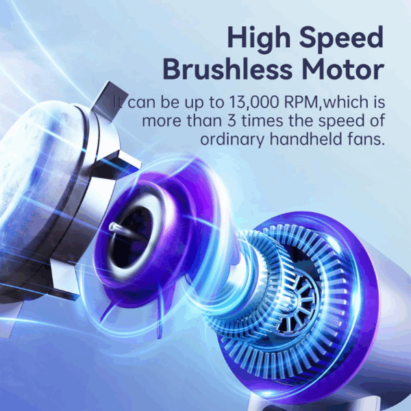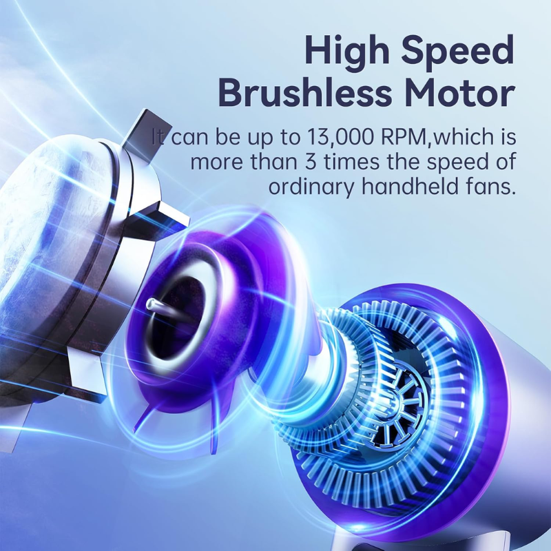 Turbo fan handheld operated: It has a high-speed and powerful 7M/S airflow. Powered by a 3 3-phase brushless electric motor running at 13000 RPM, it offers fast and strong power. Adjustable speed (1-100 levels). With a bladeless design, it protects kids and teens from danger.