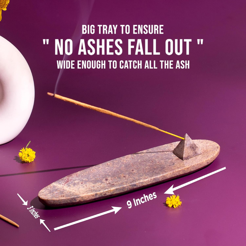 EXPERIENCE VERSATILE INCENSE BURNING: our incense sticks holder set includes a 1-inch pyramid-shaped holder allowing angled burning for ash to fall gracefully or utilize the tray’s dual holes for burning two sticks simultaneously.
