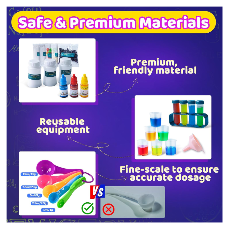 【Easy-to-Follow Instructions】Professional scientific instructions with clear illustrations ensure that kids can follow along and complete each experiment with minimal supervision, building confidence and independence. Our instructions clearly show the steps of 50 experiments, the scientific principles, and the usage and dosage of each step.