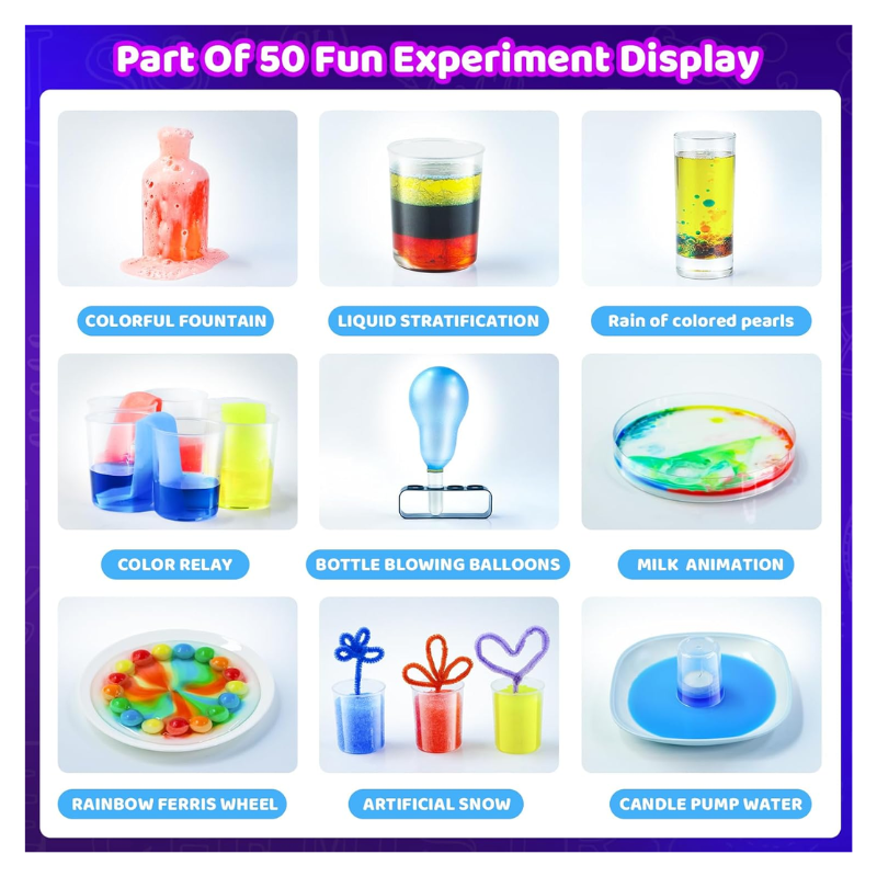 【Easy-to-Follow Instructions】Professional scientific instructions with clear illustrations ensure that kids can follow along and complete each experiment with minimal supervision, building confidence and independence. Our instructions clearly show the steps of 50 experiments, the scientific principles, and the usage and dosage of each step.