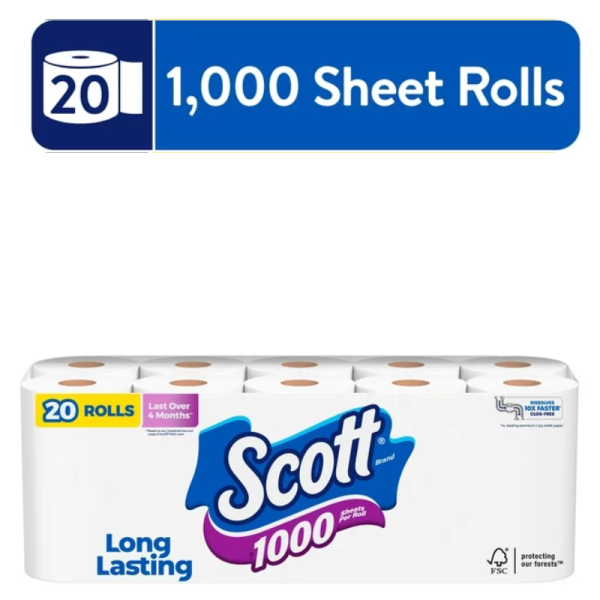 - 20 rolls, 1,000 sheets per roll, of Scott 1,000 Toilet Paper—packaging may vary from images shown.
