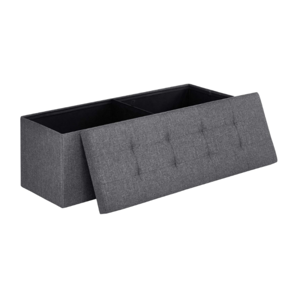This storage ottoman features stylish linen-look fabric with fine stitching. Metal corner guards help reinforce the lid, and thick MDF boards support the tops and sides, allowing the ottoman to hold a static load capacity of 660 lb. Filled with high-density foam and covered in linen-look fabric, this storage bench provides a soft, supportive, and breathable seat for optimal comfort. This folding ottoman, sized 15” D x 43″W x 15” H (38 x 110 x 38 cm) with a total capacity of 35 gallons, can be used to neatly organize your bed sheets, pillows, blankets, magazines, and more. With its unique folding design, this storage bench can be set up in just a few seconds. It conveniently folds flat for easy storage when not in use, saving space in your home.