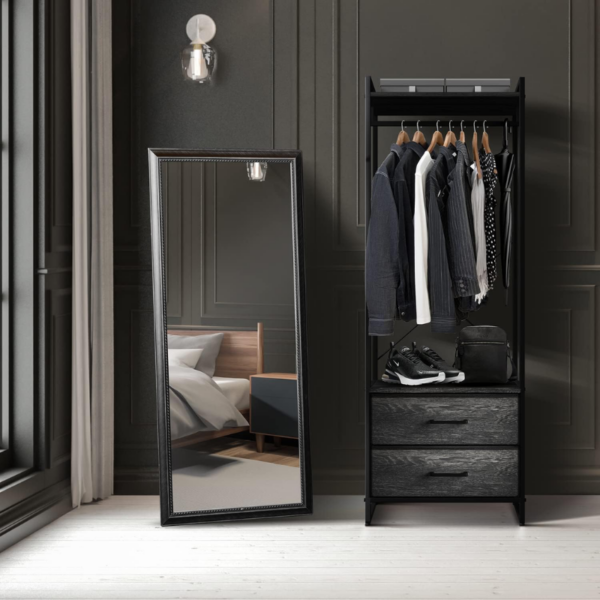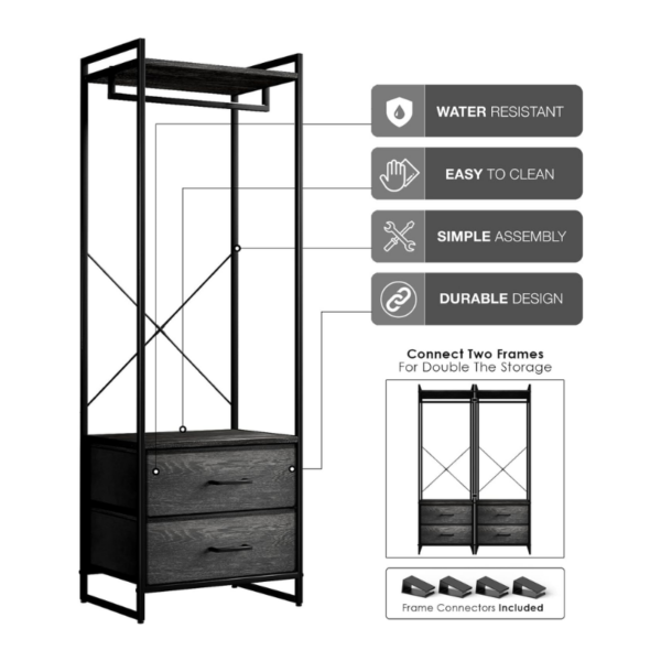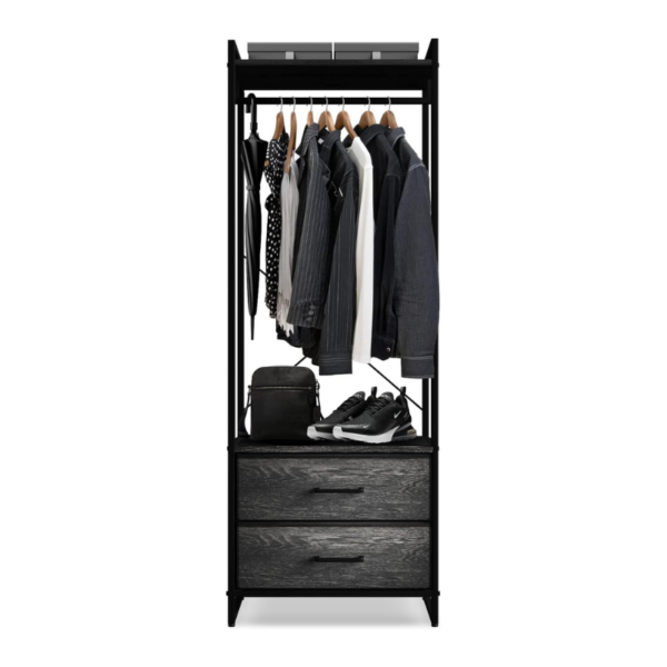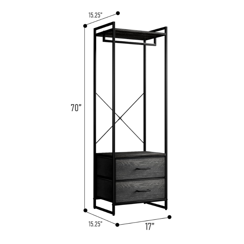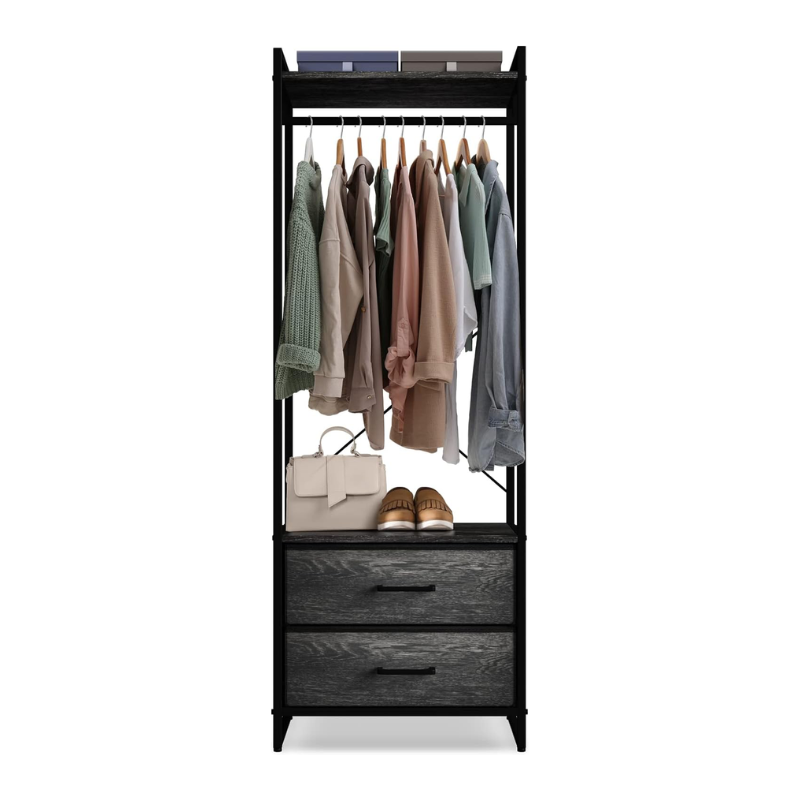 Clothing Rack Dresser — Display your closet essentials on the Sorbus Clothing Rack including shirts, dresses, pants, jackets, and more — Store smaller items in the two dresser drawers down below such as socks, underwear, & pajamas — Utilize the top shelf to store hats, purses, & boxes